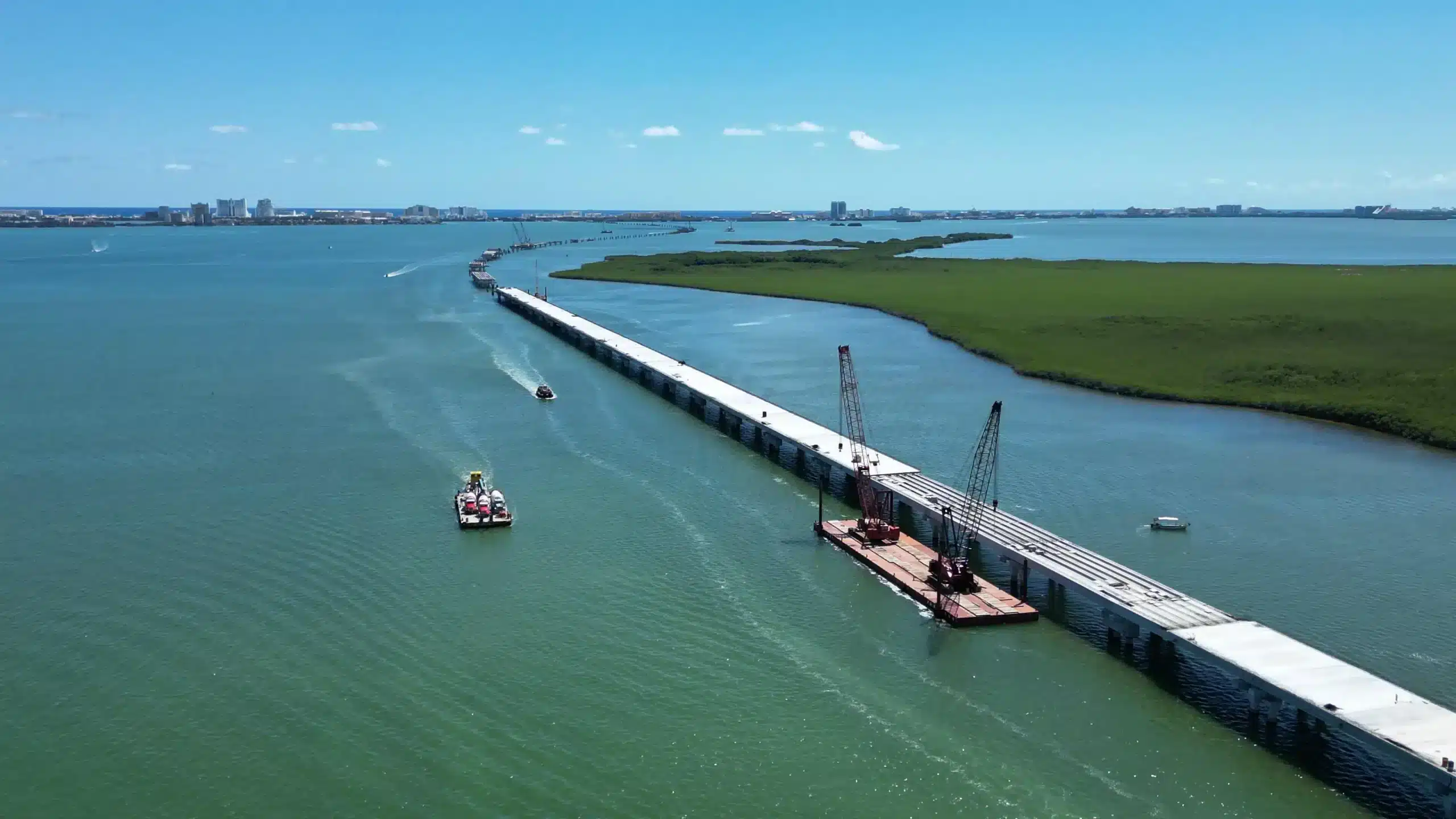 De acuerdo con lo explicado por la presidenta Claudia Sheinbaum, se tiene ya 77.8 por ciento de avance físico. El puente sobre el cuerpo lagunar será de 8.8 kilómetros de longitud con tres carriles, uno de ellos reversible, con un arco metálico.